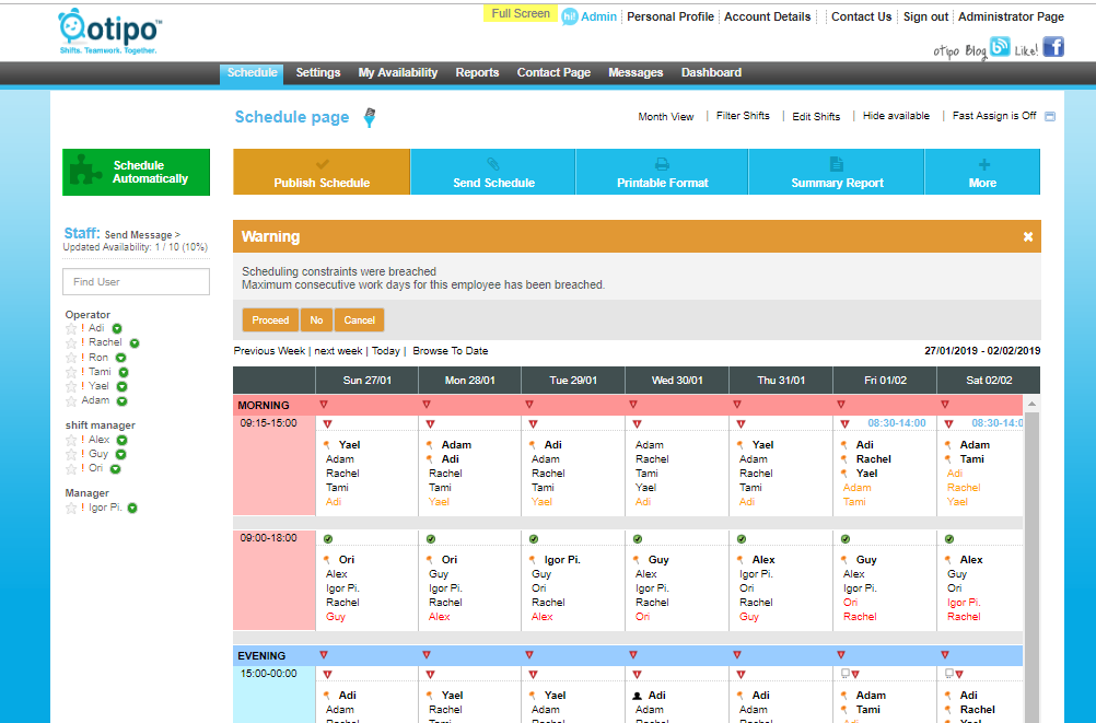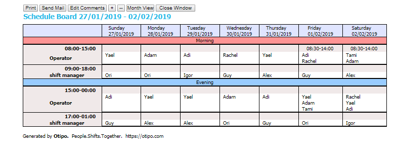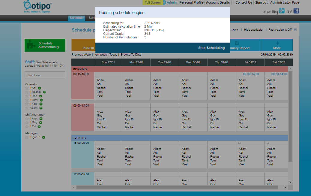 צוות הפיתוח שלנו יצר אלגוריתם חכם ל- Otipo אשר משקלל את כל הנתונים והדרישות שמוזנים אליו ויוצר סידור עבודה אולטימטיבי. 70%-90% מעבודת השיבוץ נעשית על ידי האלגוריתם שמשקלל את הנתונים שהוכנסו למערכת. השאר נתון בידי המנהל. הסידור הזה הינו גמיש וניתן לשינוי ולעריכה בכל זמן ומאפשר לראות בזמן אמת איך משפיעים השינויים על כל הסידור. יתרה מכך, כאשר מתבצעים שינויים אשר ״מפרים״ את החוקים שהוכנסו למערכת מראש בעת ההקמה, היא מתריעה על כך.