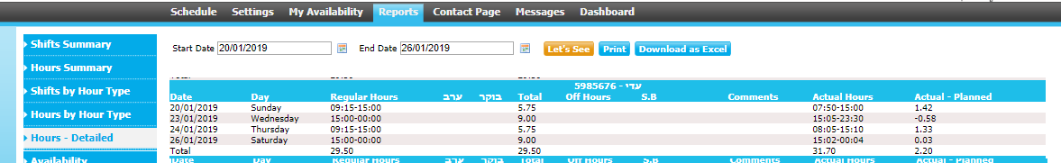 דוח שעות בפועל לעומת שעות מתוכננות בסידור: