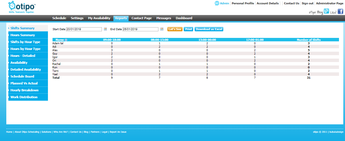 באמצעות Otipo ניתן להפיק דוחות שונים כמו למשל סיכום ממשמרות לעובד, דוח זמינות במהלך תקופה, אינדיקציה לגבי זמינויות, החלפות, מספר שעות ועוד ועוד. Otipo מאפשר לך להכיר את העובדים טוב יותר: מי העובדים הזמינים יותר, המחליפים יותר, שלוקחים על עצמם משמרות מורכבות ופחות אהודות, ומי פחות…