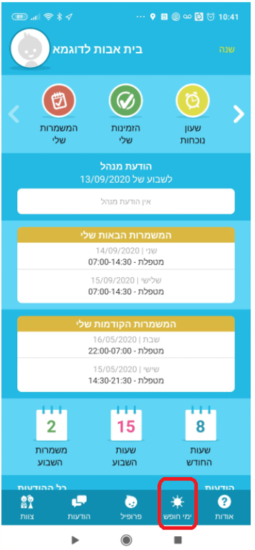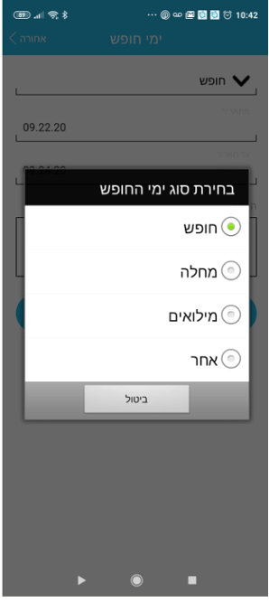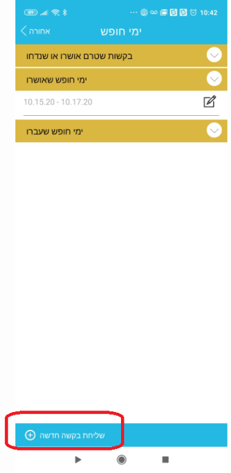 - העובד מבקש ימי חופש באפליקציה על ידי לחיצה על כפתור ׳ימי חופש׳ בתחתית עמוד הבית. זהו גם הכפתור המשמש את העובד למעקב אחר הבקשה שלו ואחר ימי החופש שנוצלו ושנותרו לניצול.