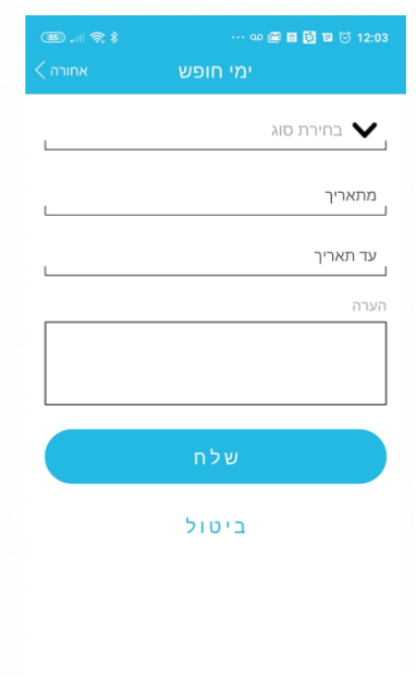 3. בטופס שנפתח העובד ממלא את סוג יום הבקשה (חופש, מחלה, מילואים או אחר), את טווח התאריכים, מוסיף הערה אישית במקרה הצורך ובסיום לוחץ על כפתור השליחה: