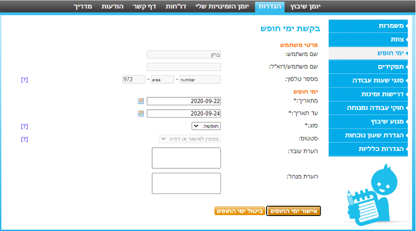 4. עם שליחת הבקשה, מנהל הסידור מקבל הודעה במייל/באפליקציה ובממשק המנהל תחת 'ימי חופש׳. המנהל מאשר או מבטל את הבקשה ויכול להוסיף טקסט חופשי בשדה במיועד לכך.