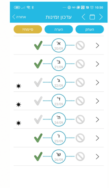 5. לאחר אישור הבקשה, זמינות ימי החופש מתעדכנת אוטומטית בממשק העובד. ימי החופש יסומנו באייקון של ׳שמש׳ בעדכון הזמינות של העובד.