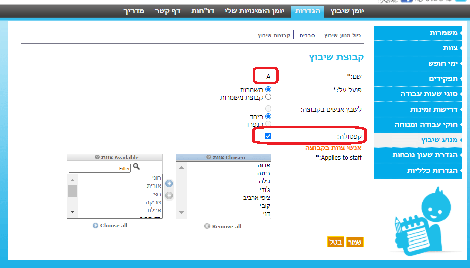 1. שם הקפסולה מופיע לצד שמות העובדים בתוך המשמרת.