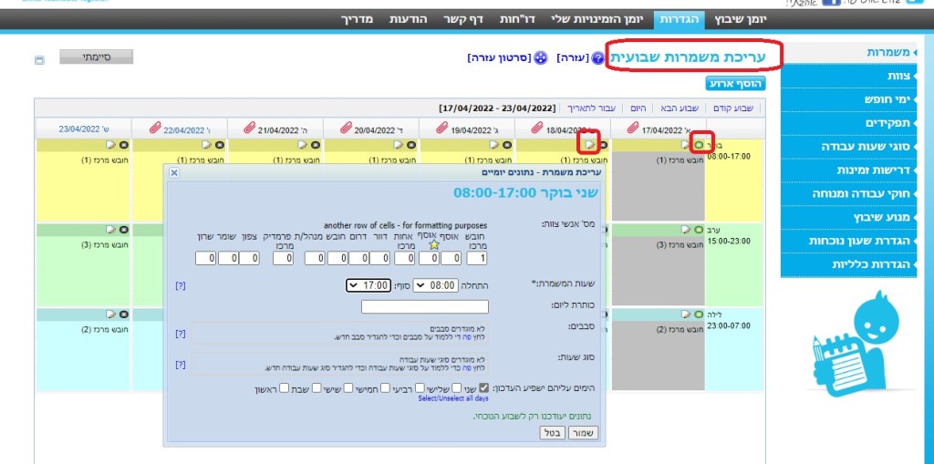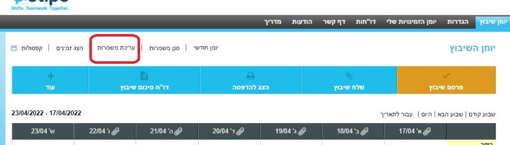 אפשר לעבור לעריכה שבועית ע"י הקלקה על 'עריכת משמרות ' ביומן השיבוץ,
