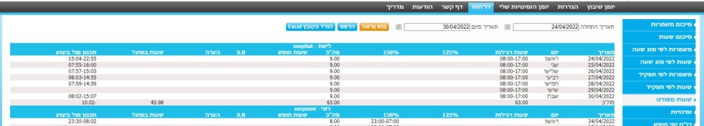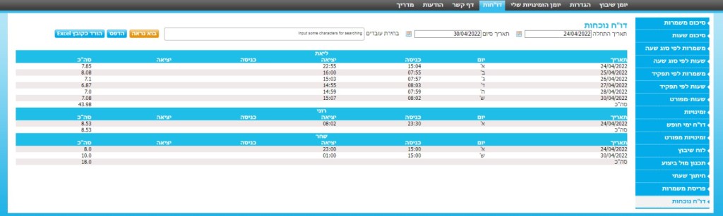 הדוח כולל שעות כניסה ויציאה של כל עובד לתקופת זמן נתונה עם ספירה של ימי חופש/מחלה/מילואים.