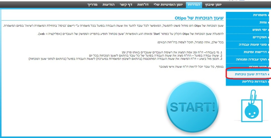 ניתן להפעיל את שעון הנוכחות בהגדרות המערכת