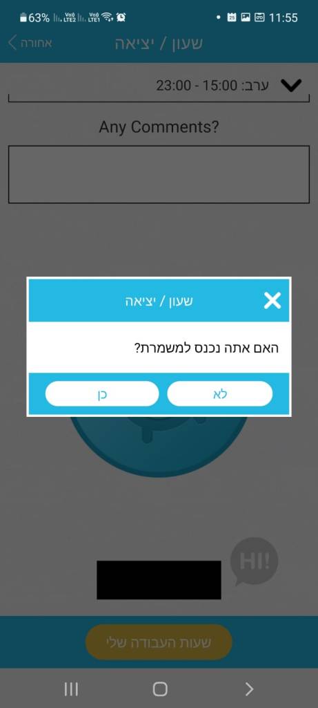 ברגע שהיכולת מופעלת נוספת אפשרות של עידכון כניסה/יציאה ממשמרת בממשק העובדים על ידי כפתור שעון נוכחות.