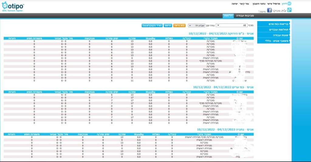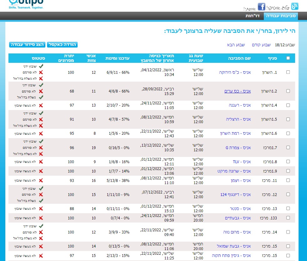 כאן מוצג דו"ח המאפשר לראות, עבור כל סניף, את הנתוני המשמרות עבור כל עובד בתפקידים השונים. דרך הדוח הזה ניתן לאסוף מידע, לדוגמא- זמינות העובדים, עבודה בכפולות ועוד.