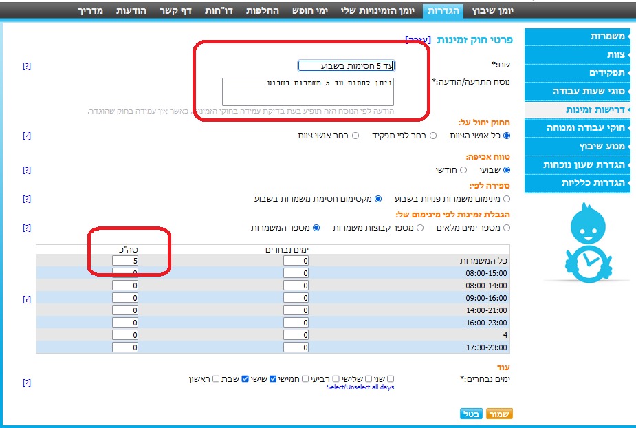 הגדרת מספר החסימות המקסימליות בשבוע נעשית בחלקו התחתון של המסך ובו אתם נדרשים להזין את מספר החסימות המקסימליות עבור כל המשמרות השבועיות.
