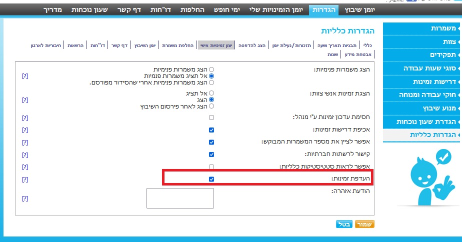 על מנת לאפשר לעובדים לסמן את העדפות הזמינות יש להיכנס להגדרות >> הגדרות כלליות >> ולסמן וי בתיבת הסימון.