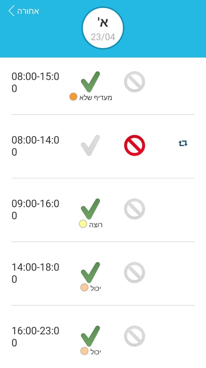 סימן הוי מעיד על שיבוץ העובד למשמרת ומתחתיו תופיע העדפת הזמניות (רוצה\ יכול\ מעדיף שלא).